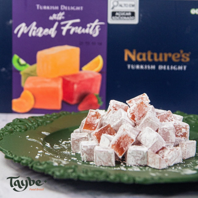 O QUE É MANJAR TURCO? Manjar Turco é um tradicional doce da Turquia, feito a partir da goma turca. Esse doce possui diversas variações de sabores, sendo este de mix de frutas coberto com um delicioso açúcar de confeiteiro. No oriente médio, o manjar turco é considerado uma honraria para a recepção de visitantes em casa. Acompanhado de um bom café ou chá, é um doce muito tradicional, que ganhou maior popularidade no ocidente ao aparecer em filmes e séries, particularmente, as crônicas de Nárnia.